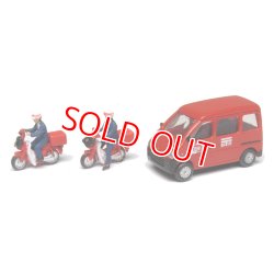 ■郵便配達…赤い配達車1台と配達バイク2台入