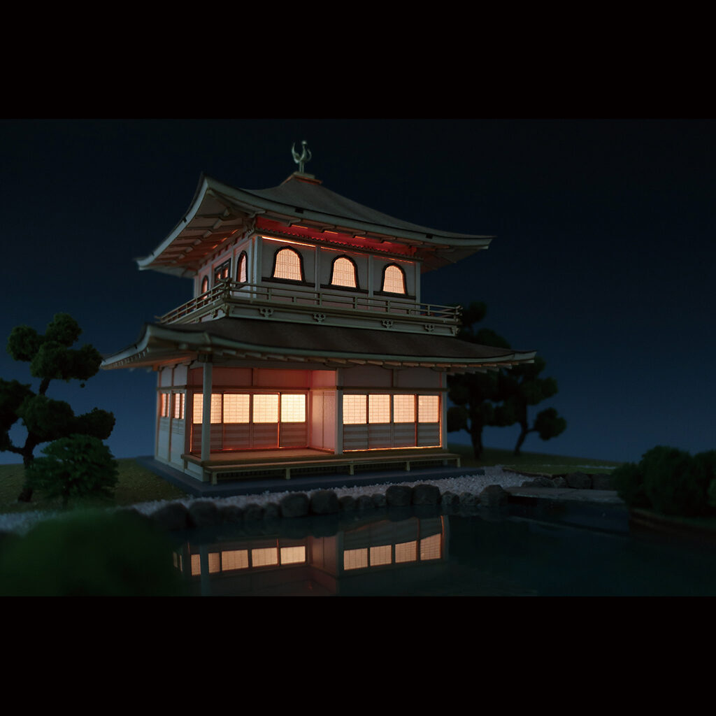 ■観音殿前の錦鏡池 (きんきょうち) や白砂の向月台、苔の美しい庭園は銀閣の見所でもあり、その情景作りも含めて製作をお楽しみ頂けます。