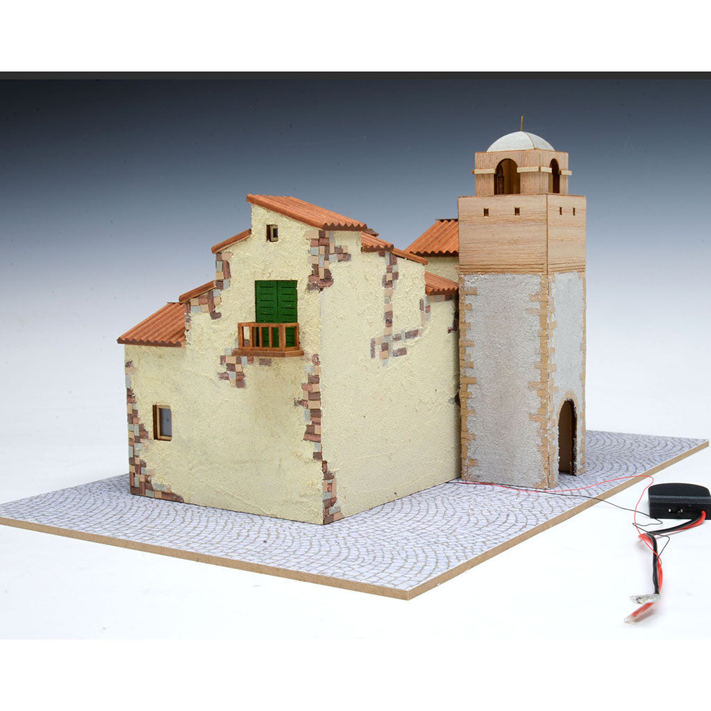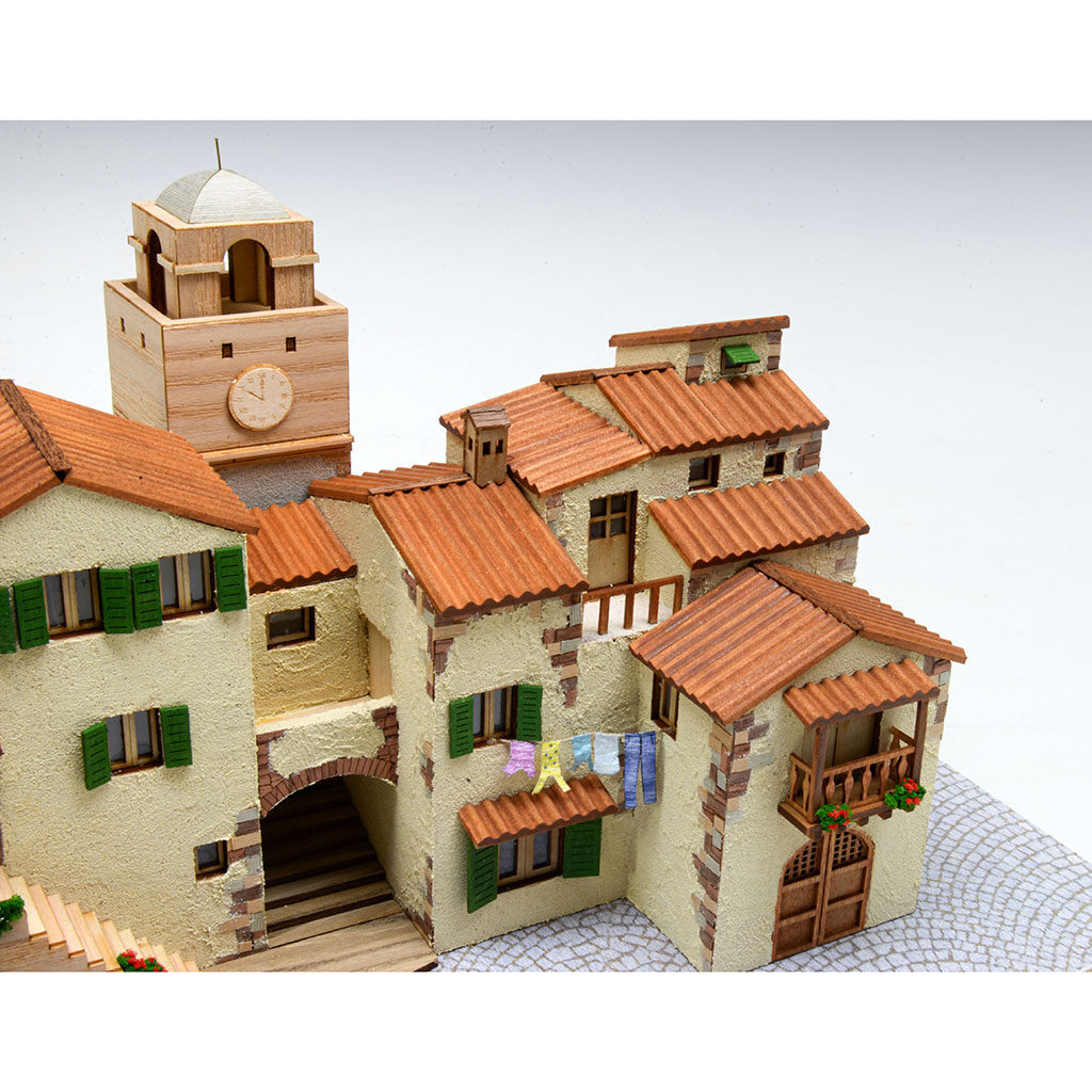 本キットではこの石造りの家を木製で再現。瓦や石壁、壁から剥がれたモザイク状のレンガに至るまで多種の木材を使用しています。トスカーナ地方にある塔の町サン・ジミニャーノや城壁に囲まれた美しい村カパルビオの絵画的な街並みをイメージしました。風に揺れる洗濯物や赤い花、塔へと続く石段の奥にほのかに灯るランプ(LEDチップライト付属)などが映画のワンシーンのような情景を演出します。