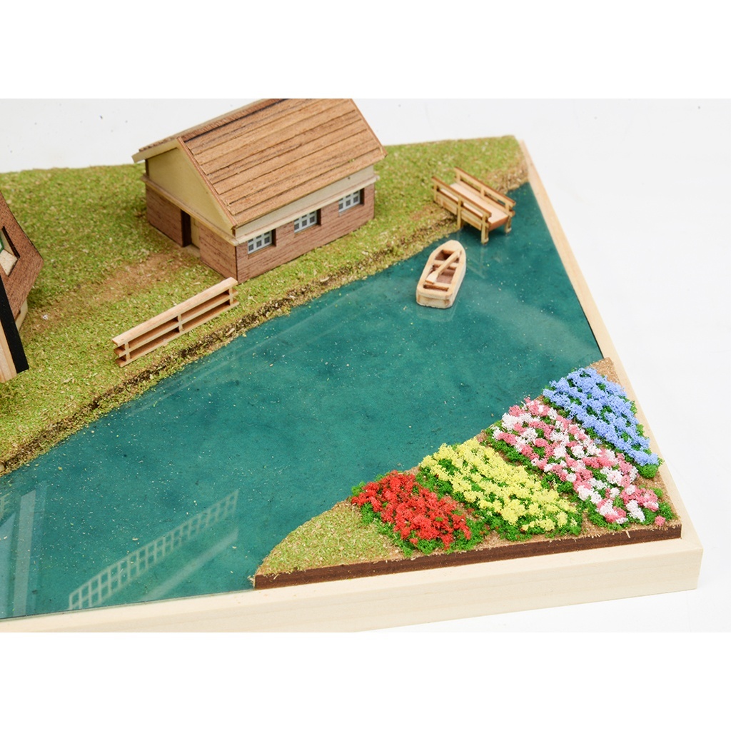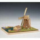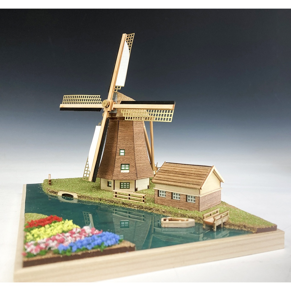 本キットは実存するオランダの風車を1/220スケールに縮尺。上質な自然木とエッチング(真鍮製)パーツによる風車のほか、小さな家や運河に浮かぶ小舟、岸辺の桟橋、カラフルなチューリップ畑まで、キット付属の材料で再現できます。