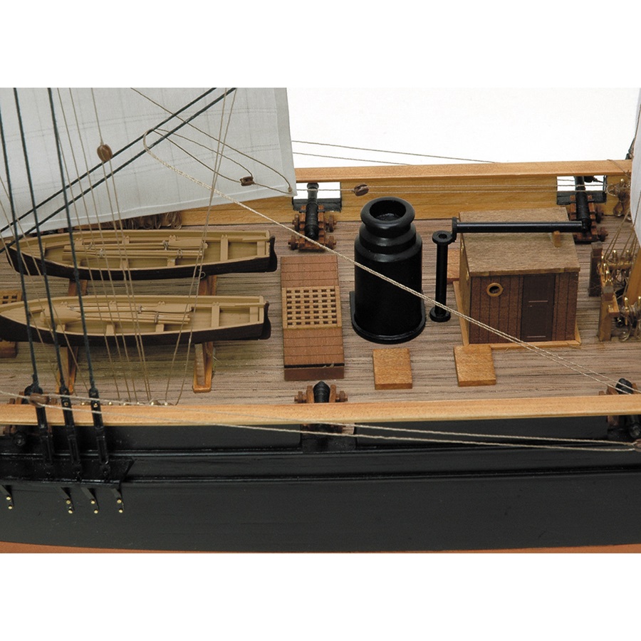 キットは精度の高い木製レーザー加工部品を中心に構成され、15枚の帆を装着した帆走状態の精密模型です。
